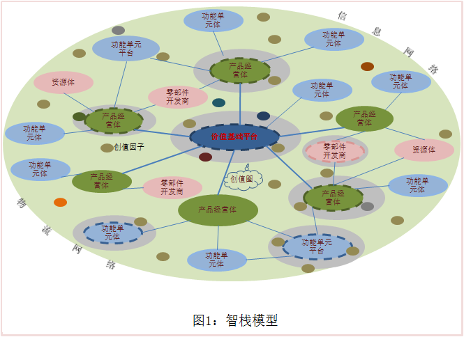 英特爾、高通、蘋果、Google、迪士尼等公司,及其各自“圈”中成(chéng)千上萬的參與主體,共同爲我們展現了正在到來的商業的生态模式的結構。這(zhè)是一種(zhǒng)分布式增強型結構,以及一種(zhǒng)基于絕對(duì)和相對(duì)比較優勢的系統架構 。我構建了一個簡單抽象的系統模型對(duì)這(zhè)類生态與結構進(jìn)行刻畫,并將(jiāng)該模型命名爲“智棧商業生态系統模型”(見下圖1)。