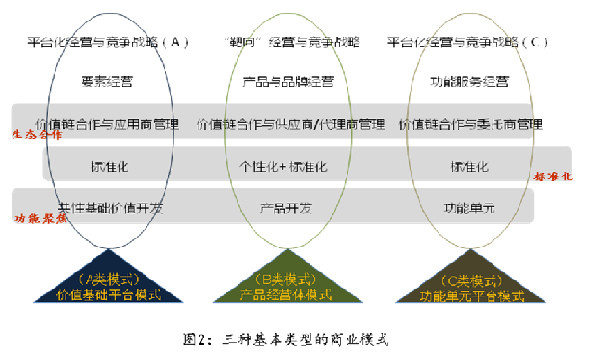 具體企業的商業模式是對(duì)完整“價值創造-商業化經(jīng)營”循環系統的個性化截取和有效截取。生态模式下,企業商業模式的基本類型有三種(zhǒng):價值基礎平台模式、産品經(jīng)營體模式、功能(néng)單元體(或平台)模式,本文中又分别稱之爲A類模式、B類模式和C類模式。A類向(xiàng)基礎性上發(fā)展,B類向(xiàng)應用性上發(fā)展,C類向(xiàng)經(jīng)濟性上發(fā)展。三類模式的主體相互協同,包括:功能(néng)協同、标準化、價值鏈合作、業務模式協同、戰略協同和協同進(jìn)化。