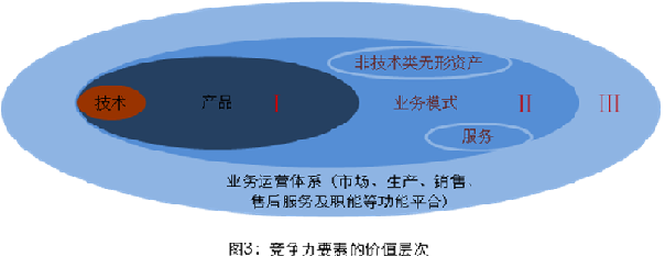 (4)平台管理與企業文化治理。平台管理包括:平台價值管理、系統(結構和規則)管理(設計與動态管理)、特質型員工的聚集等。其中,平台價值是系統的引力,沒(méi)有這(zhè)種(zhǒng)引力,生态化的結果就(jiù)是系統真的“碎”掉。在生态模式下,平台隻有作爲企業生态價值的載體,才有存在的必要和可能(néng)。有價值的商業要素都(dōu)可以作爲平台價值,但不同要素的“價值性”不同,見下圖3,越靠近技術端(圖中的Ⅰ層),要素的價值性越大。平台價值管理,包括向(xiàng)更底層性的價值要素遷移、將(jiāng)“類企業”創造的價值轉化爲平台價值、擴大生态規模(生态價值随規模遞增)等。