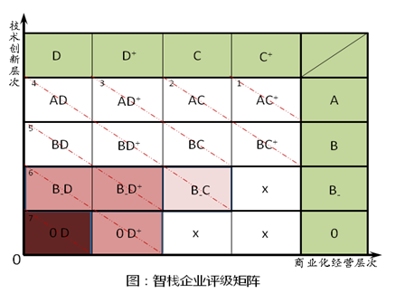 兩(liǎng)個維度及其各自的四個指标,組成(chéng)一個評級矩陣,被(bèi)命名爲“智棧企業評級矩陣”。再按技術創新和商業化經(jīng)營各50%的權重,將(jiāng)不同經(jīng)營形态的企業粗略劃分爲7個等級,見下圖。其中,B- C+、0 C+和0 C三種(zhǒng)類型的企業在理論上是不存在的,圖中用x标識,其理論含義是:沒(méi)有相應技術創新和價值基礎的企業不可能(néng)驅動一個商業化經(jīng)營(全球)生态——太陽之所以能(néng)吸引和驅動幾大行星形成(chéng)太陽“系”,是因爲其自身質量占太陽系的99%。當然,還(hái)可以對(duì)各指标做進(jìn)一步的細分,建立起(qǐ)更加精細的企業評級系統。另外,也可以在此基礎上,增加經(jīng)濟性評價維度與指标(如效率和業務規模),發(fā)展出更具整體性的企業價值評估模型。